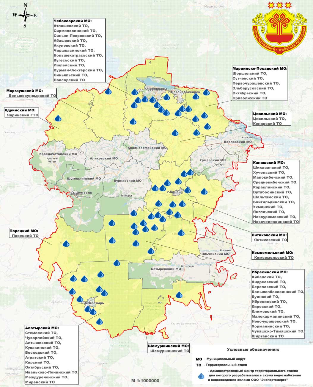 На рисунке ниже представлена карта ЧР с обозначенными районами и административными центрами поселений, для которых были разработаны либо актуализированы схемы водоснабжения и водоотведения.