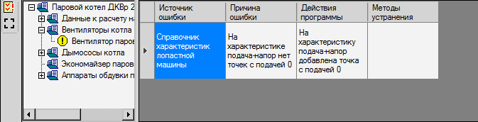 Элемент контроля данных для объекта в состав которого входят сопутствующие объекты, дополняется иерархическим списком сопутствующих объектов и для каждого из них создается отдельный протокол выявленных ошибок данных. На рисунке представлена форма элемента контроля данных для парового котла, укомплектованным вентилятором, дымососом, экономайзером и другим сопутствующим оборудованием. Чтобы просмотреть протокол ошибок, выявленных, например, по вентилятору котла, следует щелкнуть левой кнопкой мышки на соответствующем узле в иерархическом списке, тогда в таблице будут представлены все ошибки данных по вентилятору.