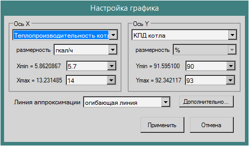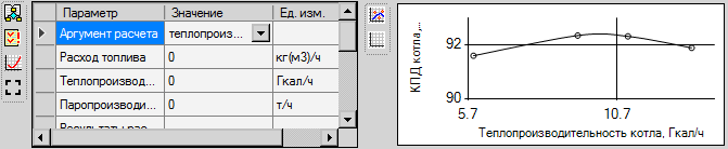 Элемент контроля данных для объекта предполагающего графическое представление данных дополняется окном графика, а вертикальная панель инструментов, в этом случае, будет содержать кнопку , предназначенную для построения графика. На рисунке представлен элемент контроля данных парового котла в виде отображения графика зависимости КПД котла от его теплопроизводительности, созданный на базе режимной карты котла.