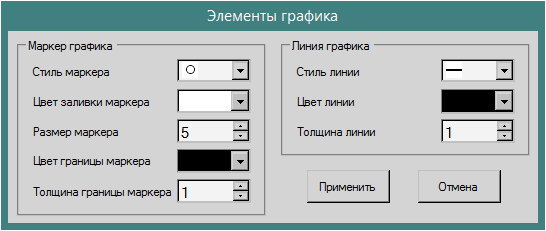 Нажав на кнопку Дополнительно пользователь получает возможность настроить атрибуты представления маркеров опорных точек графика и линии графика в диалоговом окне Элементы графика, показанном на рисунке