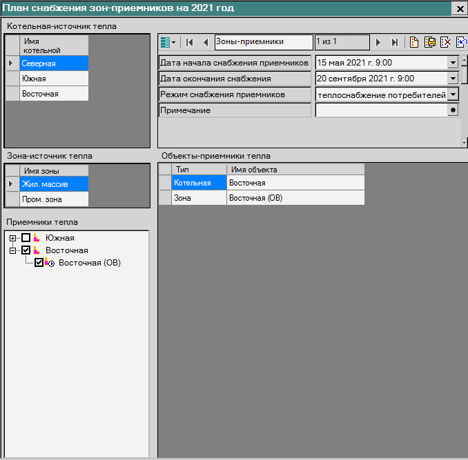 В правом верхнем углу формы размещается элемент Зоны-приемники, предназначенный для ввода информации, характеризующей план теплоснабжения зон-приемников.