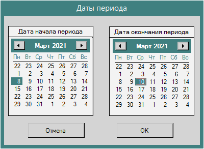 Для выбора отработанного периода, в течение которого предполагается разрабатывать суточные ведомости работы котельных, следует выбрать даты начала и окончания периода с помощью календаря и затем нажать на кнопку ОК.
