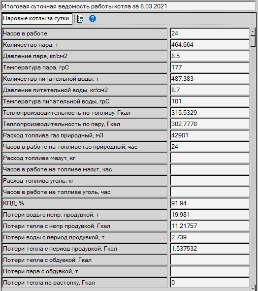 Итоги работы котла - представление результатов расчета суточной ведомости котла
