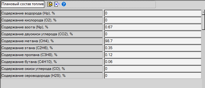 Ввод содержания компонентов топлива, применяемого в текущей котельной в течение исследуемого периода, осуществляется с помощью редактирования соответствующих полей формы (на рисунке представлена форма ввода состава газообразного топлива)
