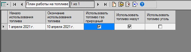 План использования топлива разрабатывается для применения в качестве исходных данных к расчетной задаче Планирование. В плане использования топлива указываются периоды работы текущей котельной на видах топлива, отличных от основного топлива для данной котельной.