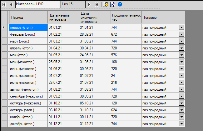Вид топлива, который следует применить при расчете текущей котельной в течение данного интервала. Значение поля выбирается из списка, сформированного на базе таблицы топлив, используемых на предприятии .