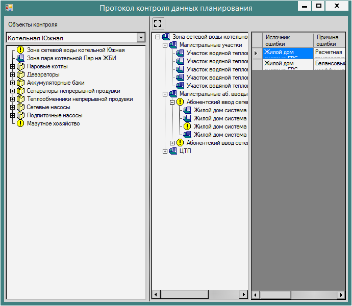 Если в списке Объекты контроля выбрана какая-либо котельная, то все объекты, относящиеся к данной котельной и участвующие в рассматриваемой расчетной задаче, будут представлены в виде иерархической структуры. Щелчок левой кнопкой мышки на узле иерархической структуры, отвечающей объекту данной котельной, делает этот объект текущим, что приводит к отображению протокола ошибок, выявленных по текущему объекту в процессе выполнения расчетной задачи.