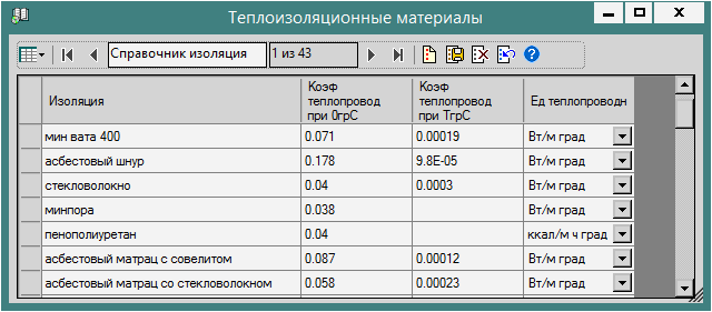 Для просмотра справочника следует щелкнуть левой кнопкой мышки на узле Теплоизоляционные материалы в дереве задач главной формы приложения