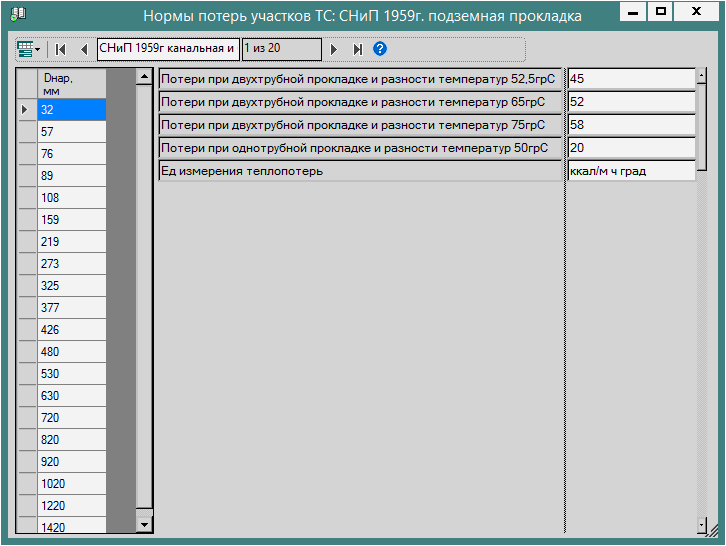 Справочники Нормы теплопотерь участков тепловых сетей. Справочники содержат нормативные значения плотности теплового потока от наружной поверхности трубопровода участка тепловой сети в окружающую среду, указанные в СНиП соответствующего года издания для различных видов прокладки. Для просмотра справочника следует щелкнуть левой кнопкой мышки на узле Вид прокладки участка в дереве задач главной формы приложения