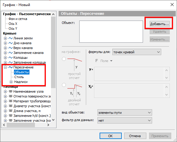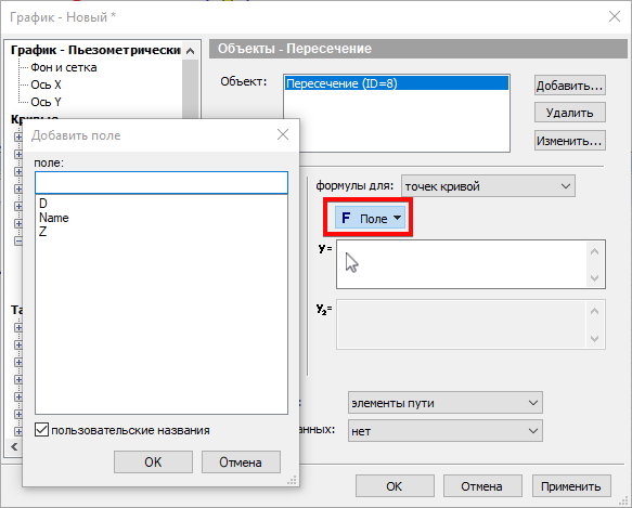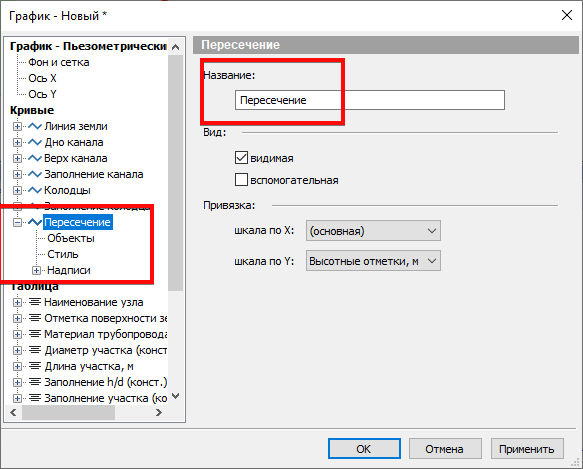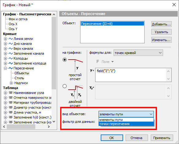 Продольный профиль (пьезографик) может отображать отдельный тип объектов Пересечения. Необходимо предварительно настроить шаблон графика.