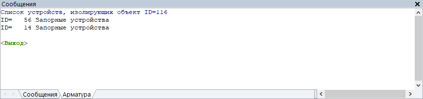 В результате в окне Сообщения на вкладке Арматура появится список всех объектов, которые отключают выбранный объект. Если окно сообщений не появилось автоматически, тогда нажмите кнопку , выберите вкладку Арматура или выберите пункт меню Окно|Сообщения, вкладка Арматура.