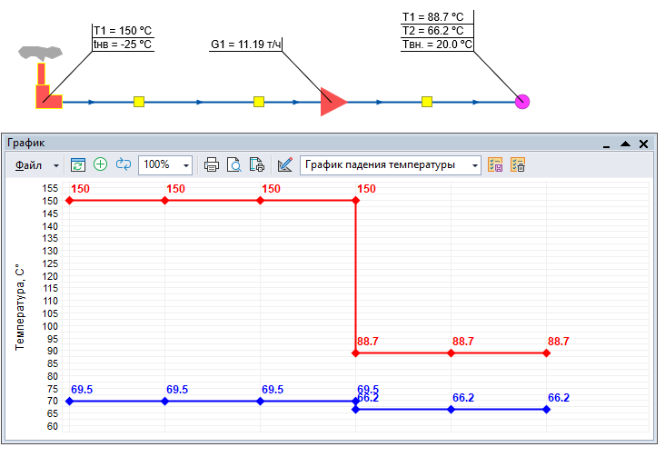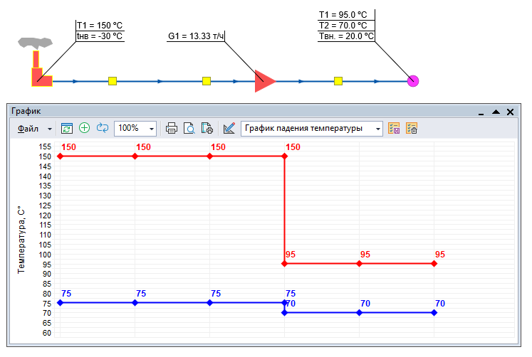 Например, далее на схеме температурный график источника: 150/75, ЦТП: 95/70, потребителя 95/70 при расчетной tнв = -30 °С.