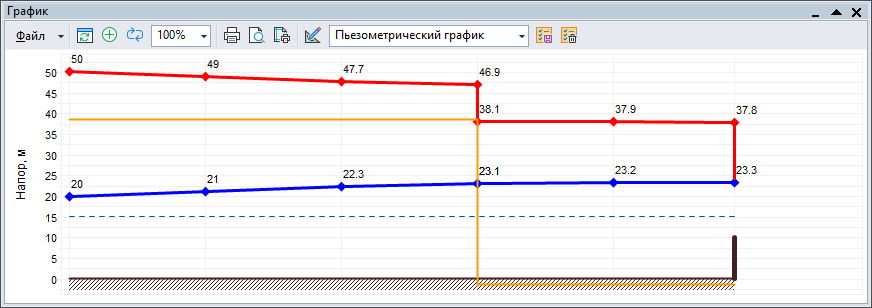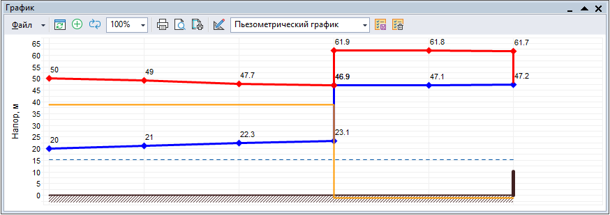 Второй регулятор работает в паре с насосом и контролирует располагаемый напор на выходе из ЦТП, заданный в поле Располагаемый напор второго контура.