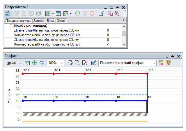 Если указать для поля в подающем, то на подающем будет бесконечное сопротивление и наоборот. Диаметр шайбы в этом случае указывать не требуется и в расчете он не участвует.