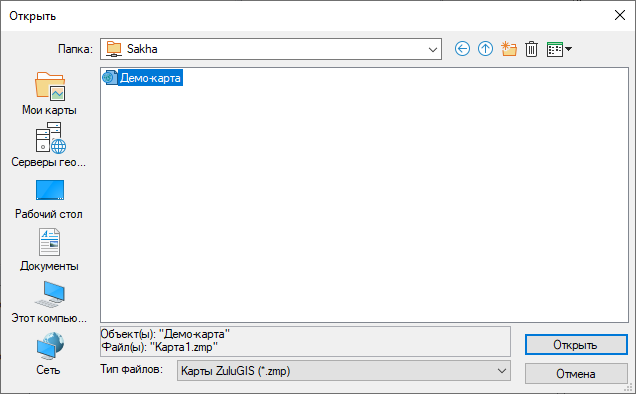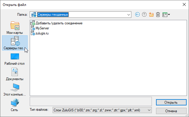 Для соединения с демо-сервером zs.zulugis.ru выберите его в списке и нажмите кнопку Открыть.