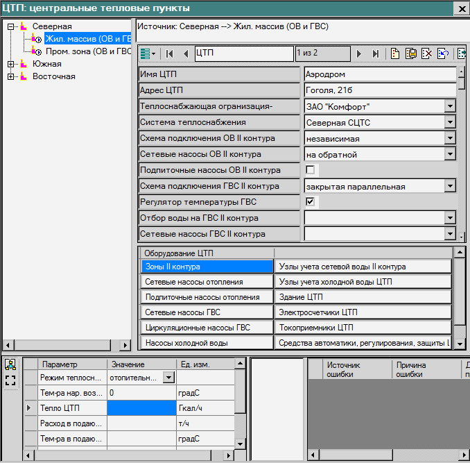 Узлы котельных в иерархической структуре маркируются пиктограммой , а узлы магистральных зон - пиктограммой . Щелчок левой кнопкой мышки на узле иерархической структуры, делает соответствующий объект системы теплоснабжения активным, а наименование активного объекта СТС отображается в поле над элементом паспортизации ЦТП.