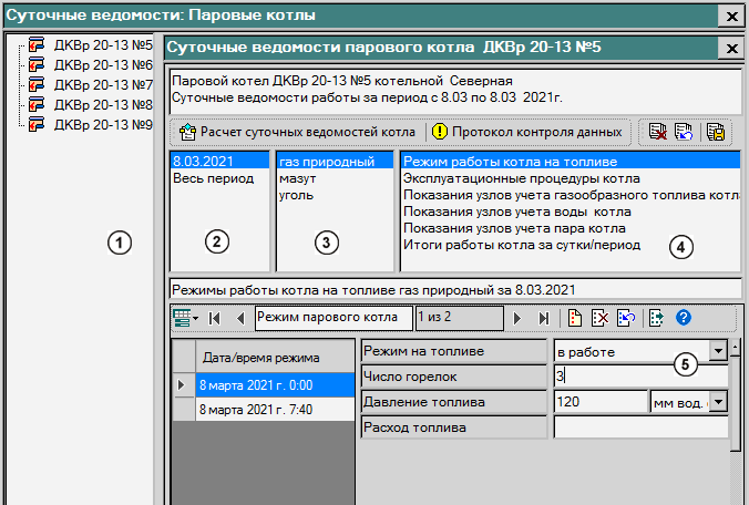 - в списке котлов (поз. 1) щелкните левой кнопкой мышки на узле того котла, который подлежит вводу суточной ведомости