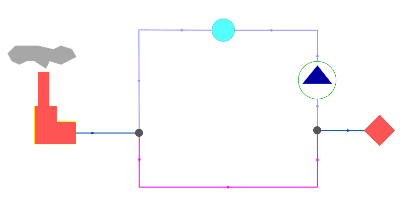 1. Для создания модели использованы стандартные векторные элементы, предусмотренные ZuluThermo для моделирования протяженных тепловых сетей, при этом применение элементов в модели имеет ряд особенностей:Трубопроводы коллектора моделируются участками в режиме «отключен подающий трубопровод», так как коллектор представляет собой однотрубную систему, и большая часть трубопроводов располагается до теплофикационных установок, после которых нагретая обратная сетевая вода считается прямой.