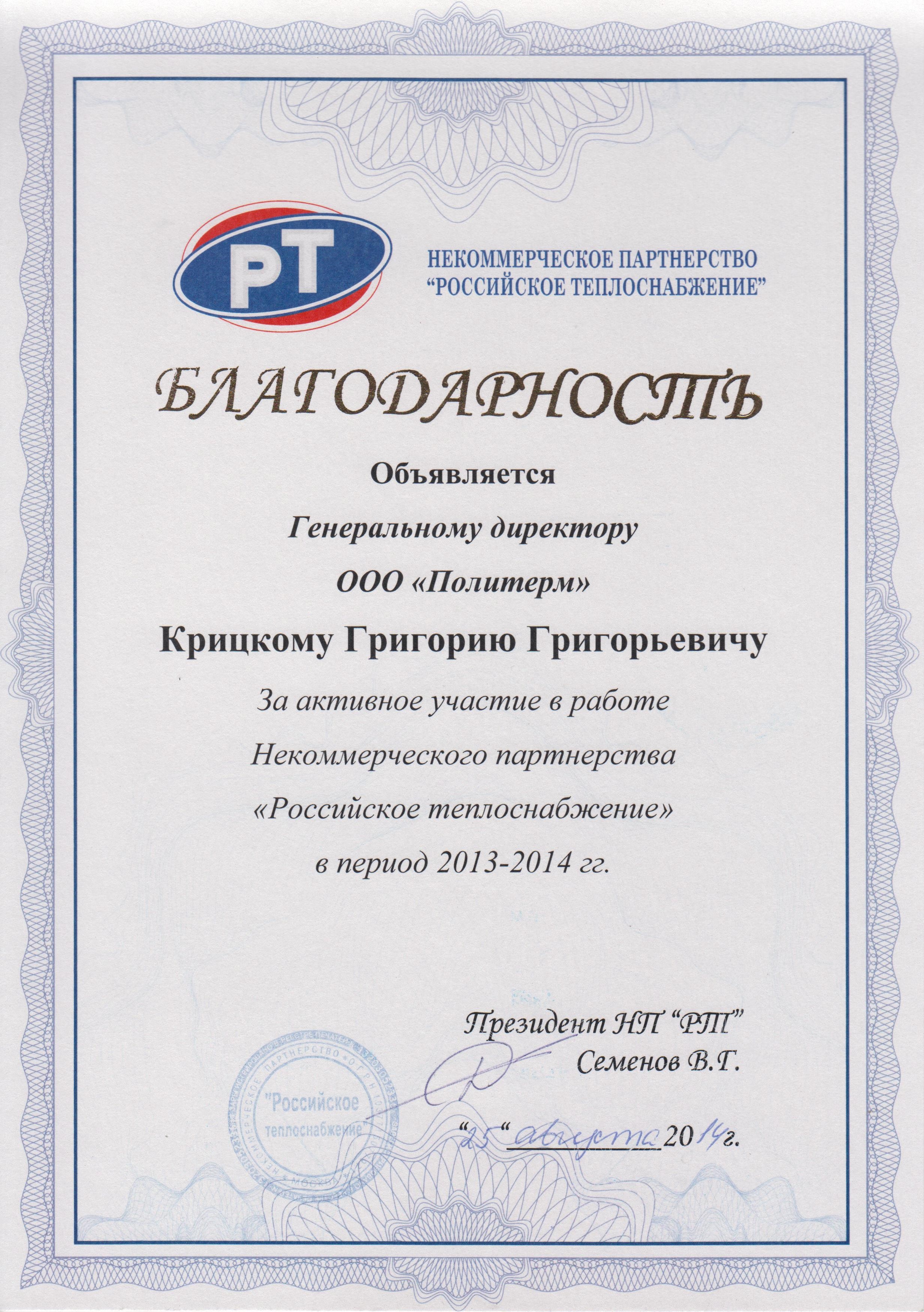 Президент НП «Российское теплоснабжение» Семенов Виктор Германович, отметил заслуги генерального директора ООО «Политерм Крицкого Григория Григорьевича, за активное участие в жизни Некоммерческого партнерства .