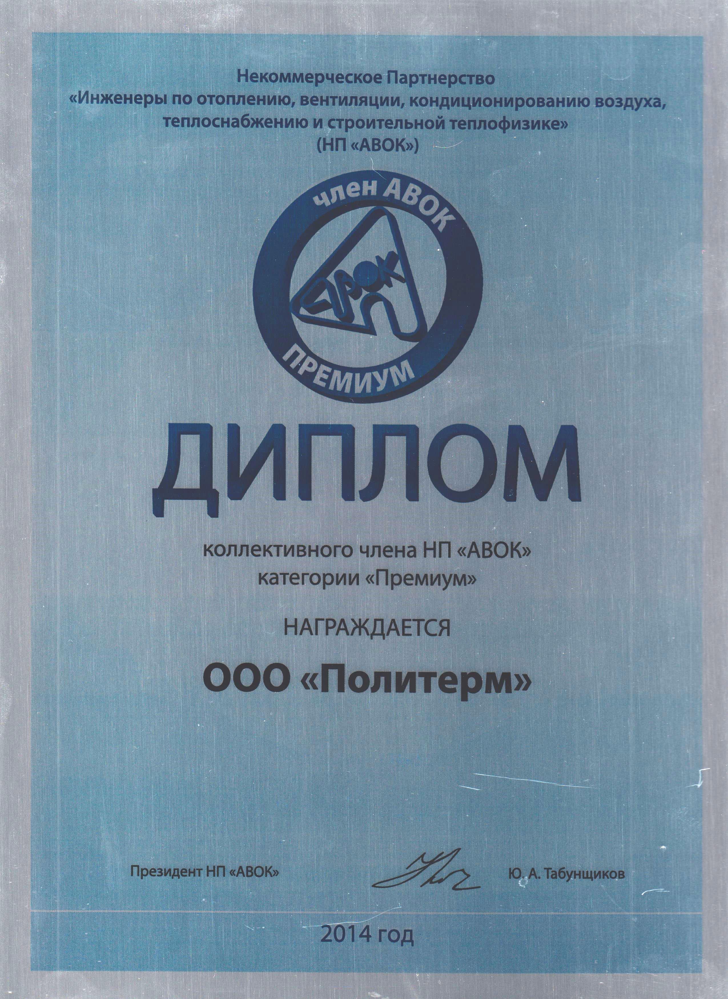 Признание ООО «Политерм» некоммерческим партнерством «АВОК»членом ассоциации, категории «Премиум»