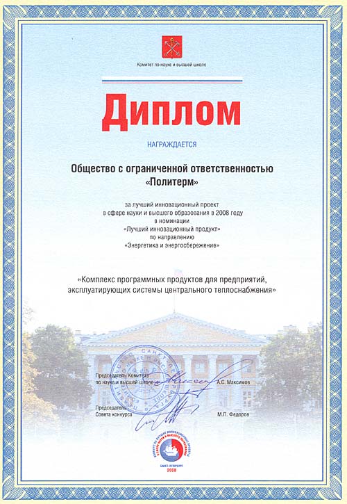 ООО «Политерм» признано победителем конкурса в номинации «Лучший инновационный продукт» по направлению «Энергетика и энергосбережение» с конкурсной работой «Комплекс программных продуктов для предприятий, эксплуатирующих системы центрального теплоснабжения»