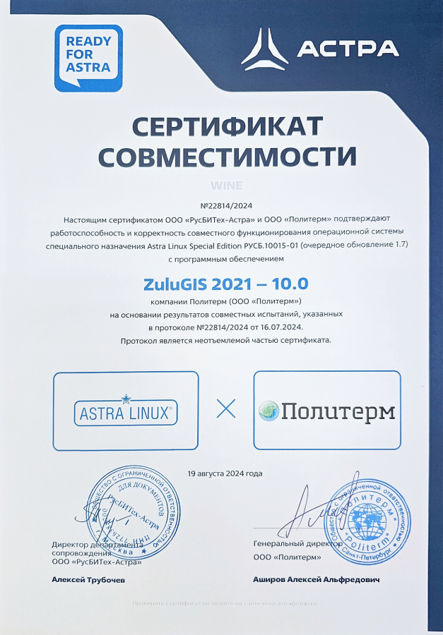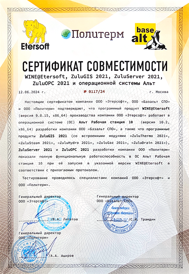 Сертификат совместимости ZuluServer 2021 и WINE@Etersoft