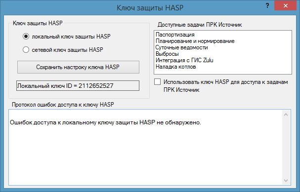 - отметьте галочкой флажок Использовать ключ HASP для доступа к задачам ПРК Источник, если предполагается получать доступ к выполнению расчетных задач, присущих ПРК Источник, посредством обращения к ключу защиты HASP