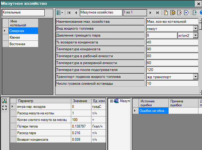 Для редактирования и просмотра характеристик мазутного хозяйства следует щелкнуть левой кнопкой мышки на узле Мазутное хозяйство в дереве задач главной формы приложения