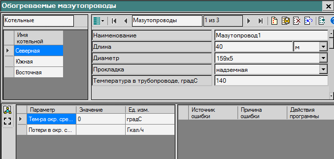 Для редактирования и просмотра характеристик обогреваемых мазутопроводов следует щелкнуть левой кнопкой мышки на узле Мазутопроводы в дереве задач главной формы приложения