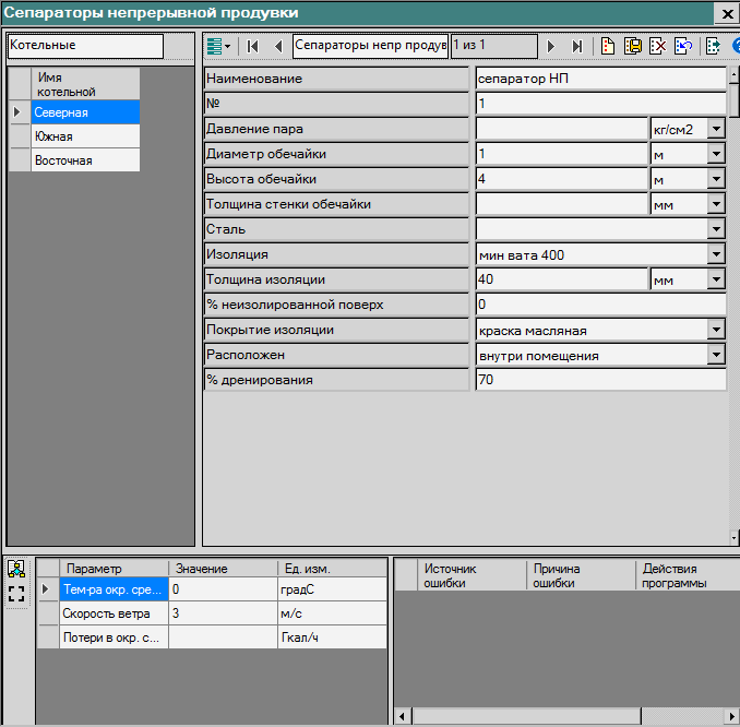 Для редактирования и просмотра информации, характеризующей сепараторы непрерывной продувки котельных, следует щелкнуть левой кнопкой мышки на узле Сепараторы непрерывной продувки в дереве задач главной формы приложения