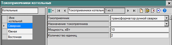 Для редактирования и просмотра информации, характеризующей токоприемники, размещенные в котельных, следует щелкнуть левой кнопкой мышки на узле Токоприемники котельных в дереве задач главной формы приложения