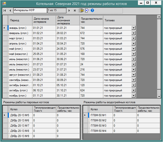 В верхней части формы Режимы работы котлов размещается элемент Интервалы НУР, в таблице которого представлены атрибуты расчетных интервалов, сформированных для вычисления нормативов удельных расходов условного топлива текущей котельной в течение года регулируемого периода.