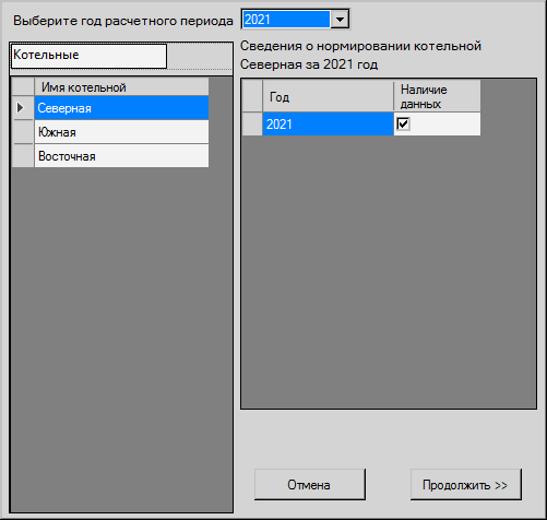 В левом углу верхней части формы размещается таблица с перечнем котельных предприятия. Котельная, на которой установлен указатель записи является текущей.