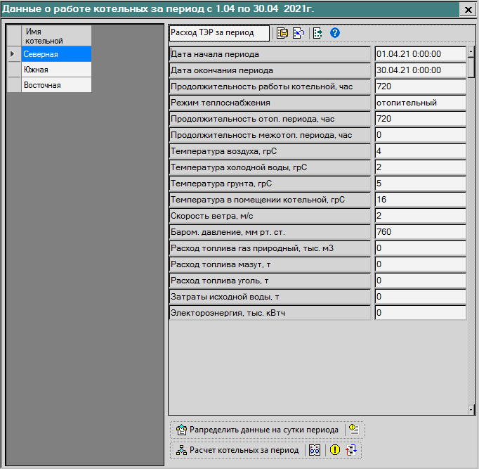 В таблице Расход ТЭР за период представлены только основные данные о работе котельных в течение исследуемого периода. Дополнительные данные, характеризующие работу котельных и котельного оборудования в течение исследуемого периода, вводятся с помощью сопутствующих процедур, которые вызываются путем нажатия на кнопку на панели инструментов элемента Расход ТЭР за период