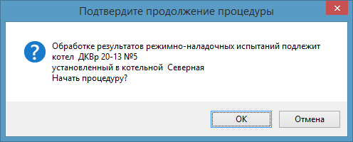 В результате описанных действий на экране будет показано сообщение, указывающее на котел, подлежащий обработке результатов испытаний