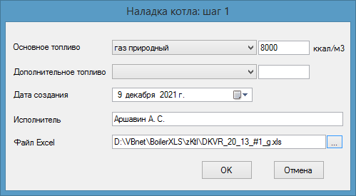 Для продолжения процедуры формирования файла к обработке результатов испытаний указанного котла, нажмите на кнопку OK., в результате чего на экране будет представлена форма Наладка котла: шаг 1