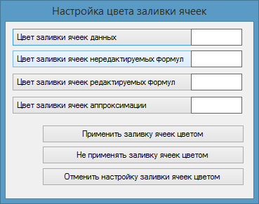 - кнопка Цвет заливки ячеек редактируемых формул предназначена для присваивания цвета заливки вычисляемых ячеек, содержащих формулы, подлежащие редактированию