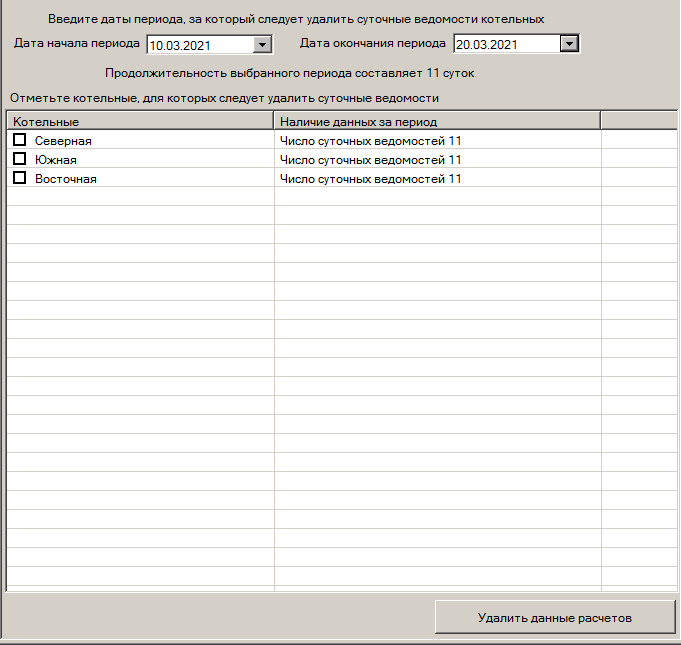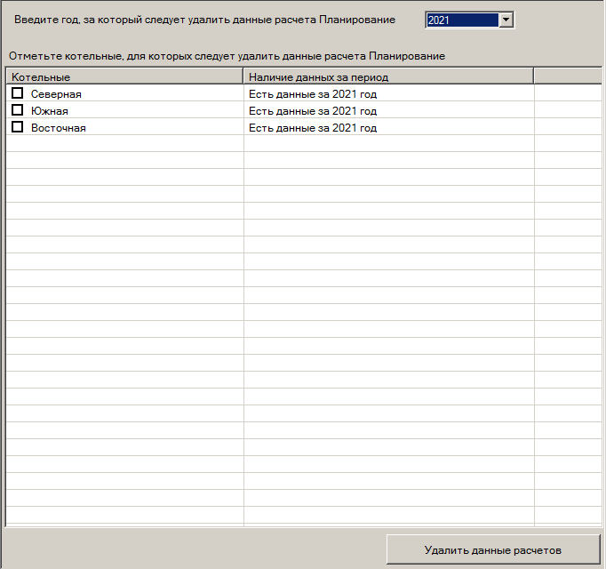 - отметить галочками котельные, подлежащие удалению исходных данных и результатов расчетов по выбранной задаче