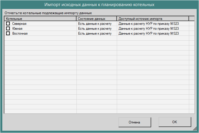 В столбце Котельные представлен перечень котельных, для которых возможен импорт данных, флажок слева от наименования котельной предназначен для указания, что данная котельная будет подлежать процедуре импорта исходных данных к рассматриваемой расчетной задаче за исследуемый период. Столбец Состояние данных является указателем на наличие исходных данных, ранее уже введенных к расчетной задаче-источнику данных. Столбец Доступный источник импорта содержит наименование расчетной задачи-источника данных. Для выполнения импорта исходных данных к расчету котельных в контексте рассматриваемой задачи в течение исследуемого периода (например, года) следует