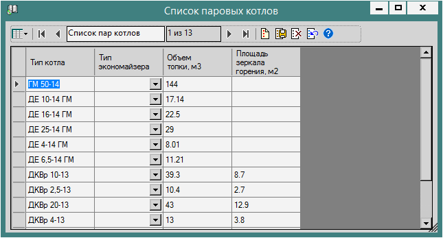 Для редактирования или просмотра списка паровых котлов следует щелкнуть левой кнопкой мышки на узле Список паровых котлов в дереве задач главной формы приложения