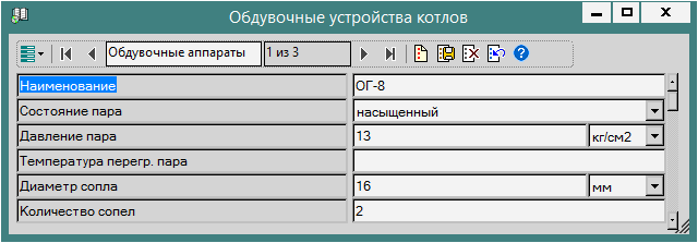 Для редактирования или просмотра справочника обдувочных устройств следует щелкнуть левой кнопкой мышки на узле Обдувочные устройства в дереве задач главной формы приложения
