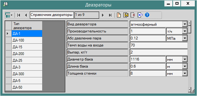 Справочник деаэраторов содержит информацию о характеристиках типовых деаэраторов.
