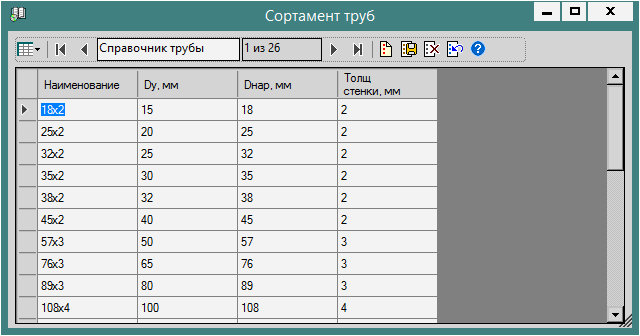 Справочник Сортамент труб. Справочник содержит информацию о характеристиках труб, применяемых в системах теплоснабжения и в котельных. Для просмотра справочника следует щелкнуть левой кнопкой мышки на узле Сортамент труб в дереве задач главной формы приложения