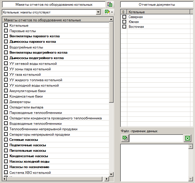 В правой верхней части формы размещается перечень котельных предприятия. Отчетные документы по выбранному типу оборудования создаются для котельных, отмеченных галочками.