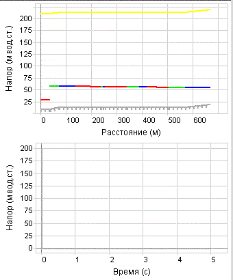 Во время процедуры расчета пользователь наблюдает распространение бегущих волн давления и скорости вдоль маршрута. По результатам расчета строятся графики: