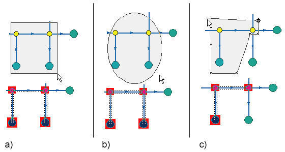 Возможно выделение объектов «полностью входящих» в область или «полностью входящих или касающихся области». Настройка способа пересечения осуществляется в контекстном меню режима выделения областью. Для этого: