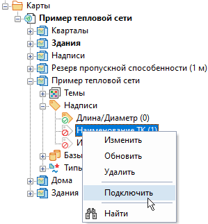 Подключить те или иные надписи к тому или иному слою на карте, означает указать системе для какого слоя какой вариант из ранее созданных надписей выводить на карту. Можно надписи подключать как поштучно так и подключить все надписи карты или слоя одновременно.