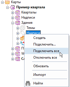 Возможно подключить одновременно все надписи определенного слоя или карты.