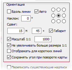 Если необходимо чтобы при повороте карты надписи сохраняли свой угол, то есть не изменяли угол наклона, то нужно установить опцию Сохранять угол при повороте карты, в противном случае надписи будут повернуты в соответствии с поворотом карты.