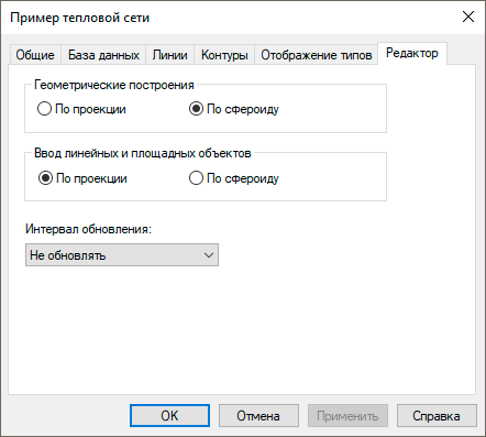 Во вкладке Редактор выбирается, каким образом будут строится геометрические построения и вводиться линейные и площадные объекты. Так же настраивается интервал обновления данных на рабочих местах пользователей при работе с ZuluServer.